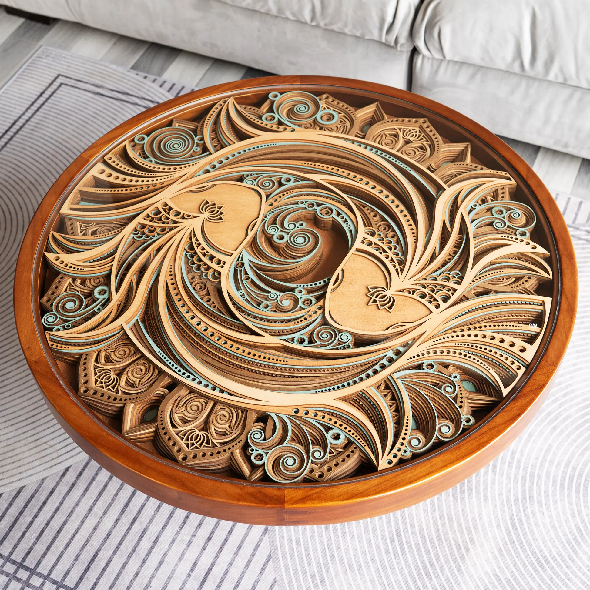 Crafted from premium elm wood for the base, paired with laser-cut basswood plywood for the intricate koi design, each element is hand-glued with precision. The table is finished with a protective layer of 3C-certified tempered glass, ensuring durability and elegance.